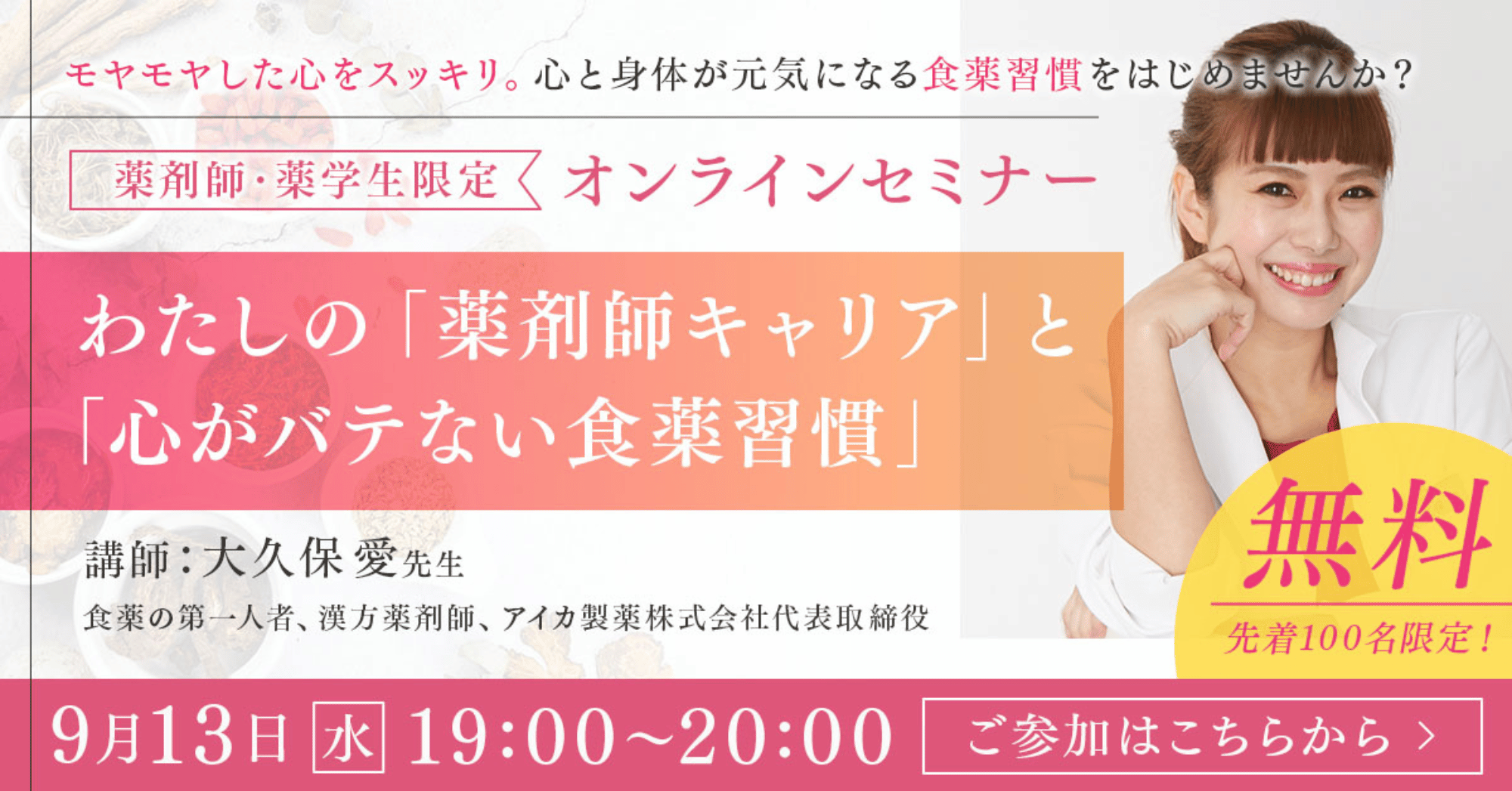 無料オンラインセミナーのご案内です。食薬の第一人者であり、漢方薬剤師、国際中医師である大久保愛先生を講師にお招きし、「わたしの『薬剤師キャリア』……