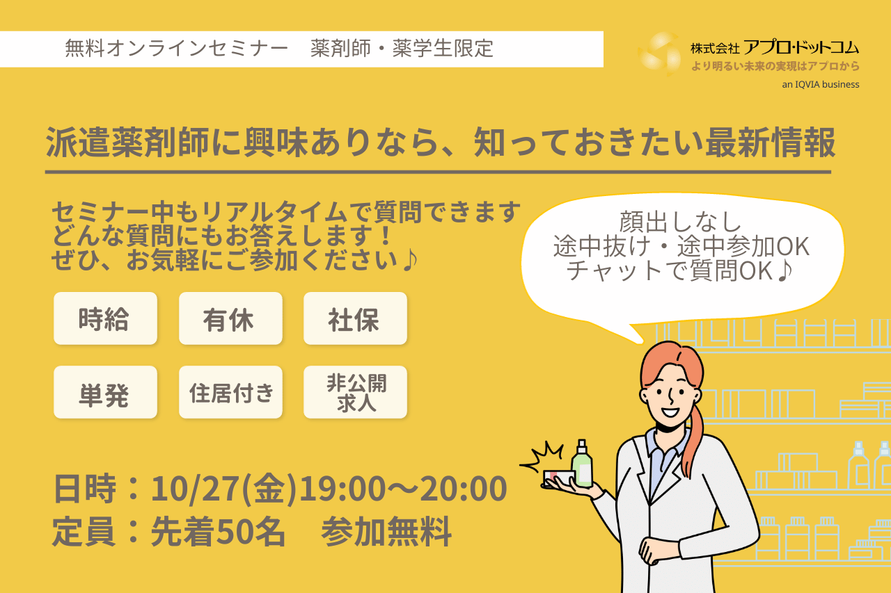 薬剤師の仕事・働き方・キャリアに関するトピックスから、最新の薬剤師求人、派遣や単発派遣に関する法律やルールまで。薬剤師の最新事情に精通したアプロ・ドットコムのスタッフが、就職・転職に役立つ記事を配信いたします。
