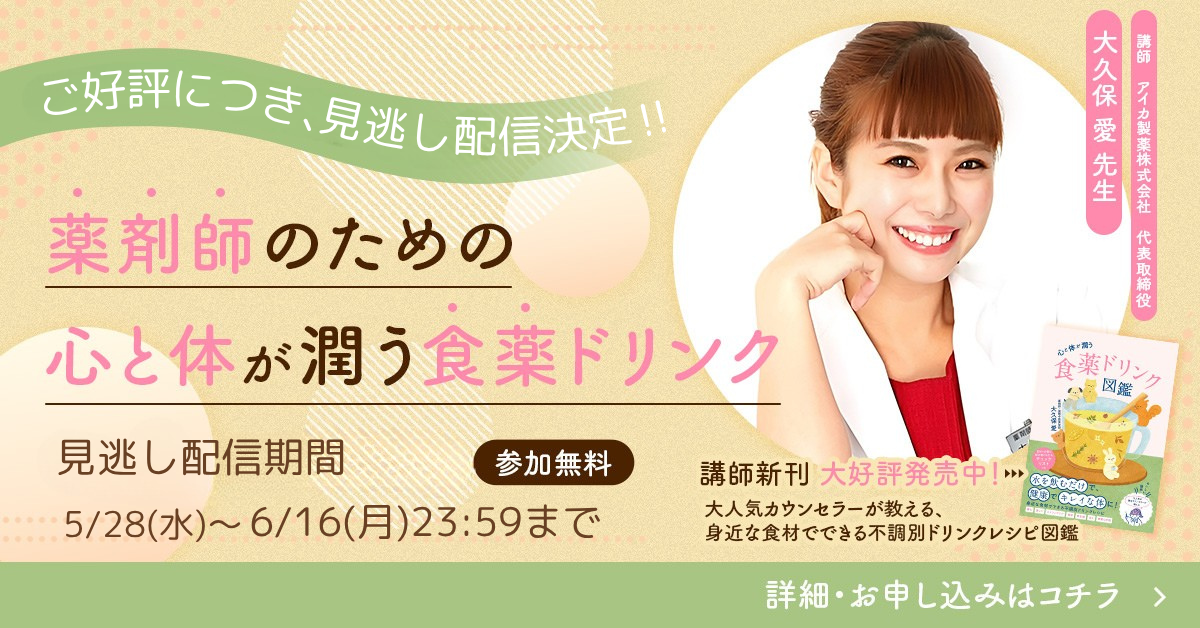 無料オンラインセミナーの見逃し配信のご案内です。5/16開催のセミナーで、食薬の第一人者であり、漢方薬剤師、国際中医師である大久保愛先生を講師にお……