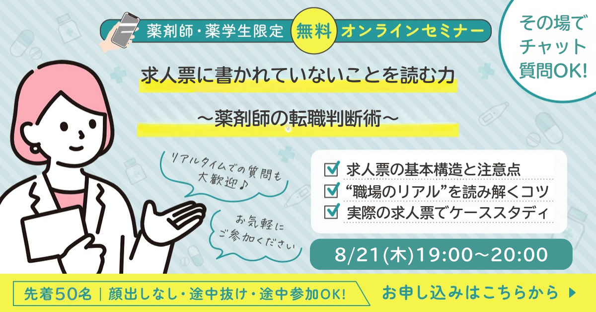 終了しました)【8/21開催】求人票に書かれていないことを読む力-薬剤師の転職判断術-|オンラインセミナー