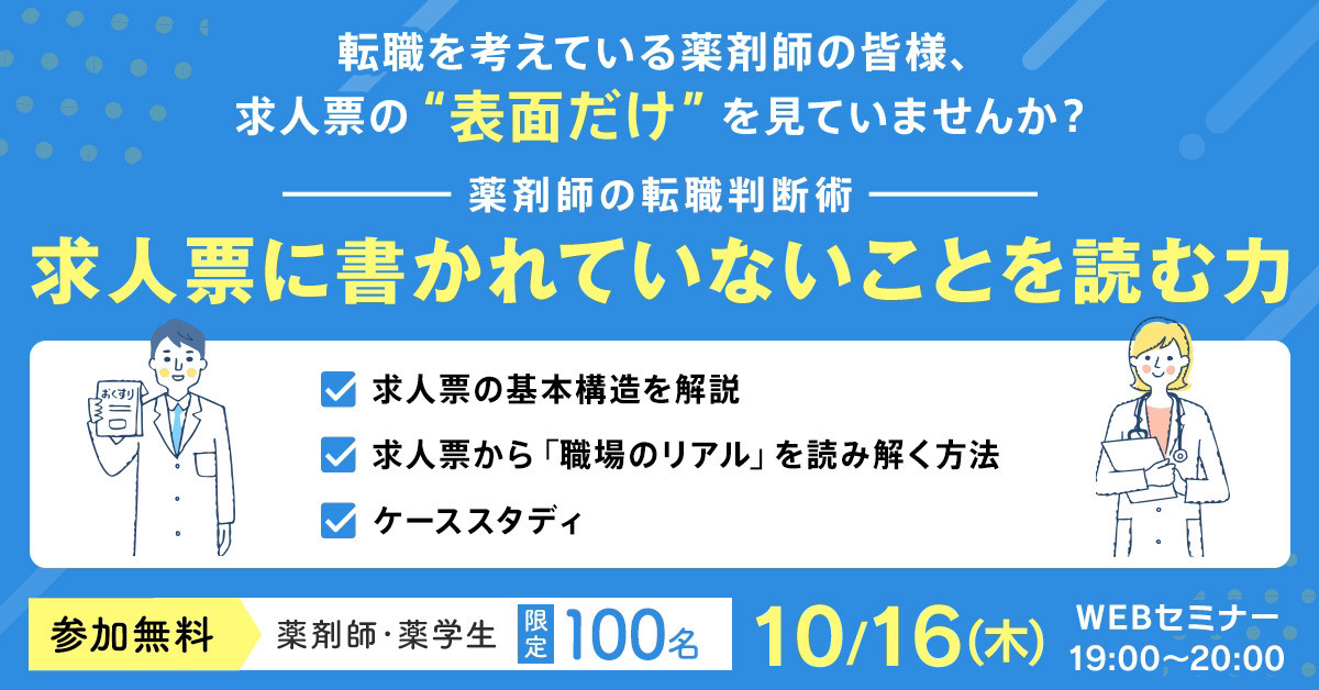 終了しました)【10/16開催】求人票に書かれていないことを読む力〜薬剤師の転職判断術〜|webセミナー