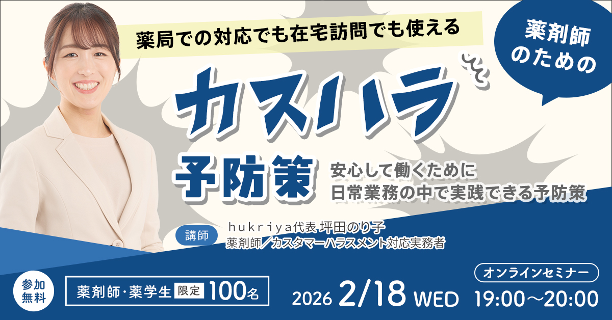 終了しました)【2/18開催】薬剤師のためのカスハラ予防策-薬局での対応でも在宅訪問でも使える-|webセミナー